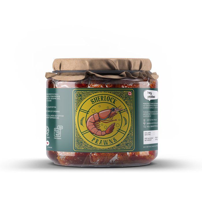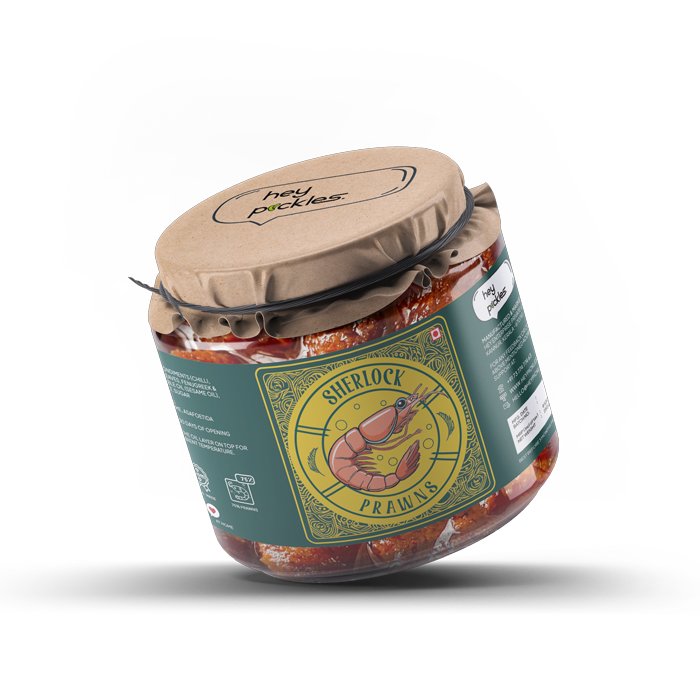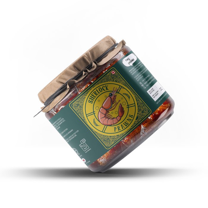 Unravel the mystery of exquisite taste with Sherlock Prawns, a gourmet pickle crafted with succulent prawns (75%) and a perfectly balanced blend of bold spices and condiments. Each jar is a culinary masterpiece, bringing together the fiery kick of chili, the zest of garlic and ginger, and the aromatic goodness of curry leaves, fenugreek, and mustard.